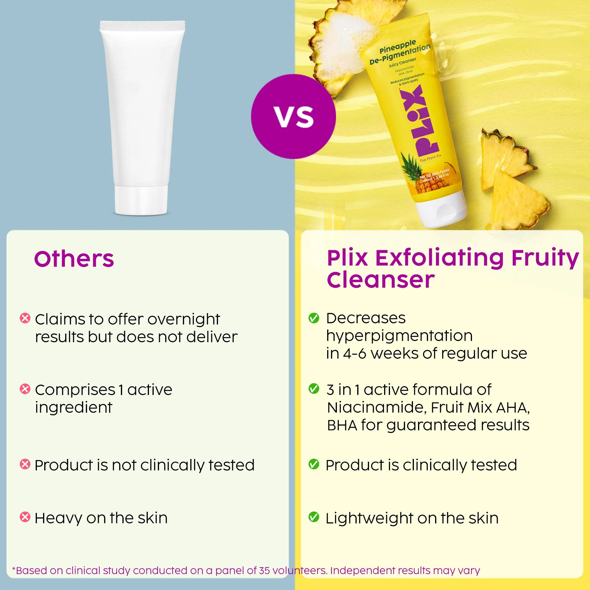Plix Pineapple De-Pigmentation Juicy Cleanser with Niacinamide is a brightening daily face wash that helps reduce pigmentation, dullness, and uneven skin tone while cleansing deeply. The Plix Pineapple De-Pigmentation Juicy Cleanser with Niacinamide removes dirt, oil, and impurities and supports clearer, fresher skin.